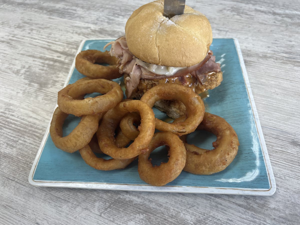 Grilled ham and provolone cheese piled on top our country fried chicken with our special sauce. Served on a Kaiser roll with one side.